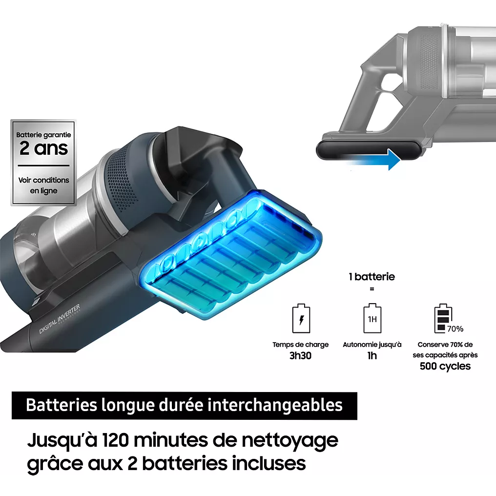 L’autonomie du Bespoke Jet Plus VS20B95B43N est un de ses points forts. Sa batterie longue durée permet de nettoyer de grandes surfaces sans interruption. Elle est également amovible, offrant la possibilité de la remplacer ou d’en ajouter une seconde pour prolonger l’usage lors de sessions prolongées.