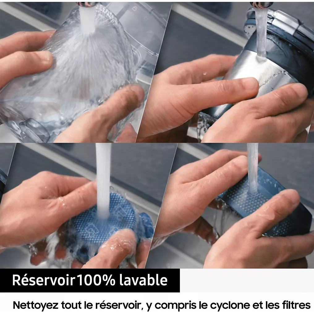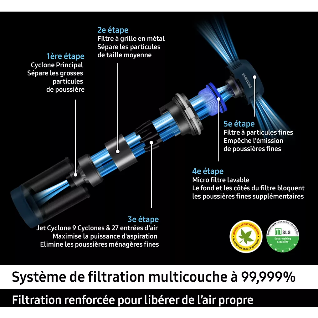 L’un des atouts majeurs du SAMSUNG Jet 85 Pro VS20C85G7TB réside dans son système de filtration avancé. Grâce à un dispositif multicouche, il piège jusqu’aux particules les plus fines, améliorant ainsi la qualité de l’air intérieur.