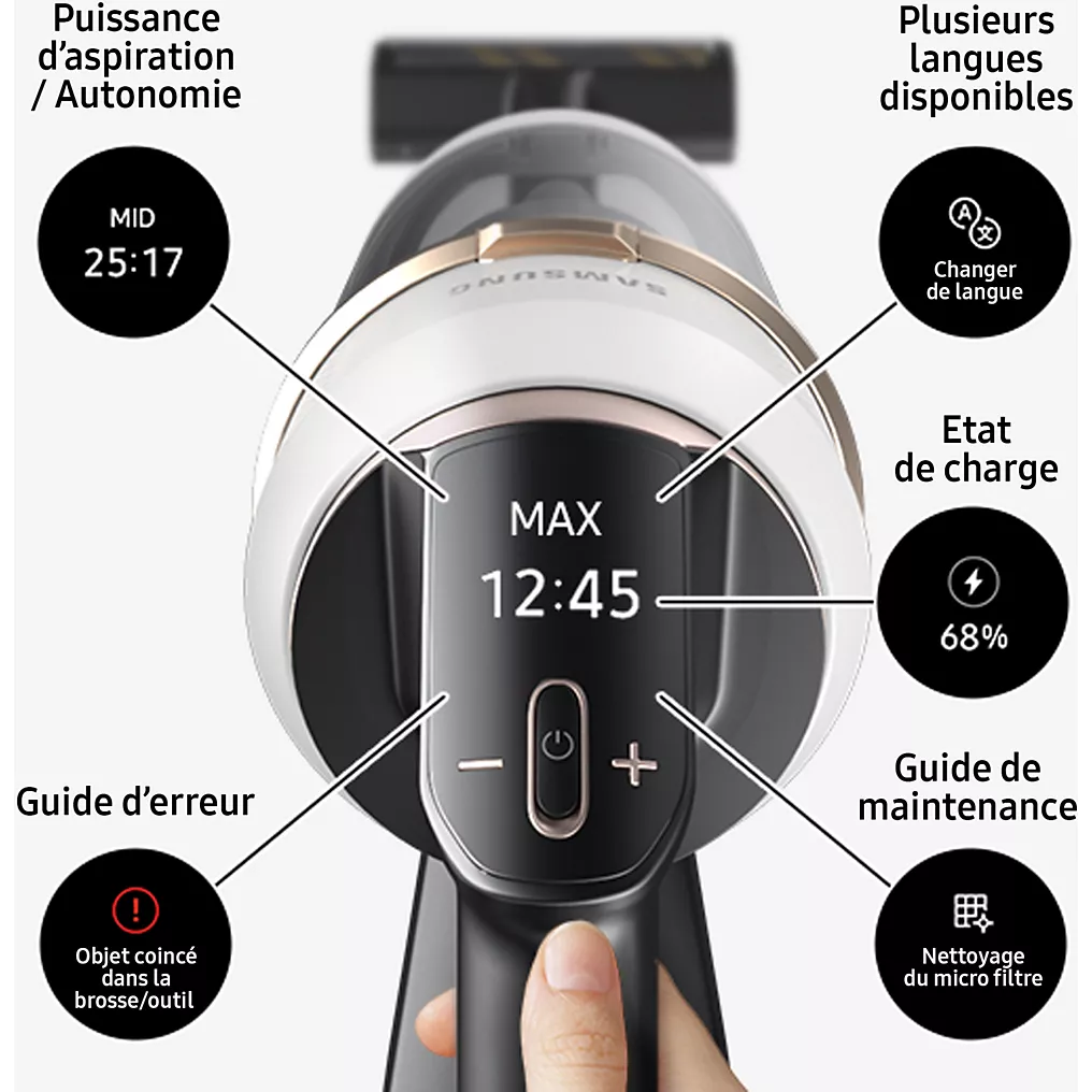 Sur le marché des aspirateurs sans fil, le SAMSUNG Jet 85 Pro VS20C85G7TB se démarque par :