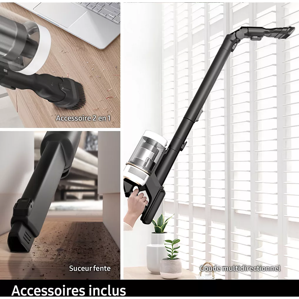 Samsung fournit une sélection d’accessoires pratiques et complémentaires qui renforcent la polyvalence du Jet 85 Pro. Ils permettent d’adapter l’appareil à toutes les situations quotidiennes :