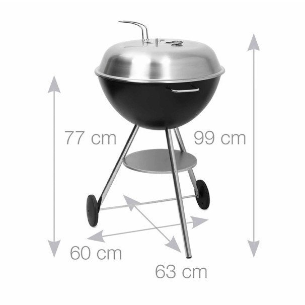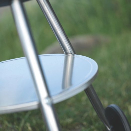 Léger (14 kg), monté sur 3 pieds et 2 roues, il se déplace facilement. Une étagère polyvalente sert à tenir plats chauds ou ustensiles, et le couvercle se fixe solidement sur le côté lorsqu’il n’est pas utilisé.