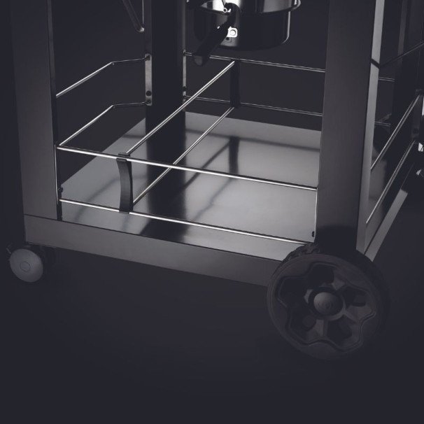 - Un chariot pratique : Il possède un chariot à roulettes, dont 2 grandes roues tout terrain et 2 roues multidirectionnelles avec freins et une tablette rabattable avec des crochets afin de suspendre vos ustensiles. Il est équipé d’une poignée de transport afin de le transporter où bon vous semble. Un autre espace de rangement est disponible afin de ranger votre housse de protection lors de l’utilisation par exemple. La petite touche en plus, un décapsuleur est intégré au chariot.