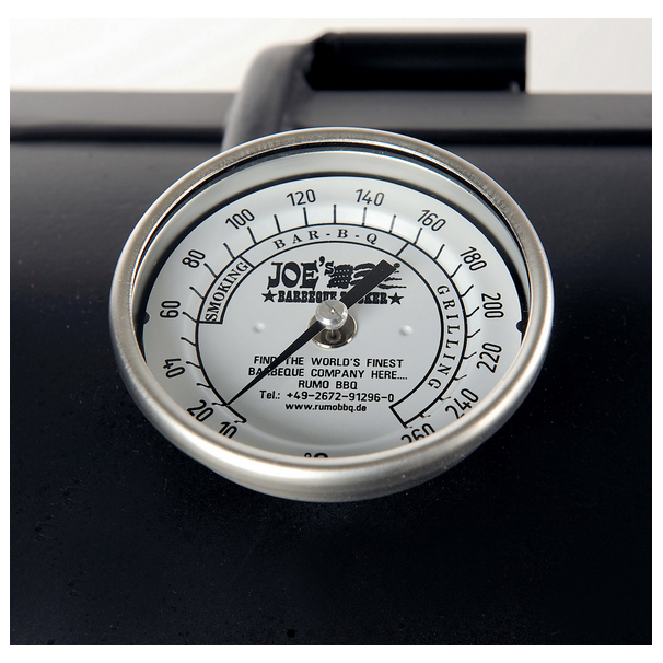 Un tuyau vertical avec des clapets de ventilation réglables, permet de réguler l’apport en oxygène et donc la chaleur dans la chambre de cuisson et la fumée en l’aspirant à travers la chambre de cuisson. Le capot du barbecue est également équipé d’un thermomètre.