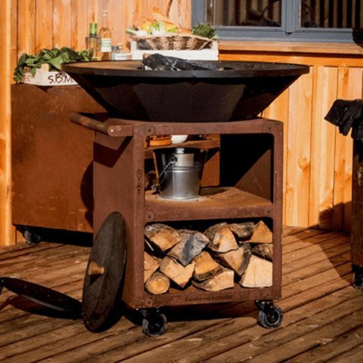 Le brasero plancha combine deux fonctions : un foyer central pour profiter d’un feu de bois, et une plaque de cuisson qui permet de griller ou saisir des aliments directement.