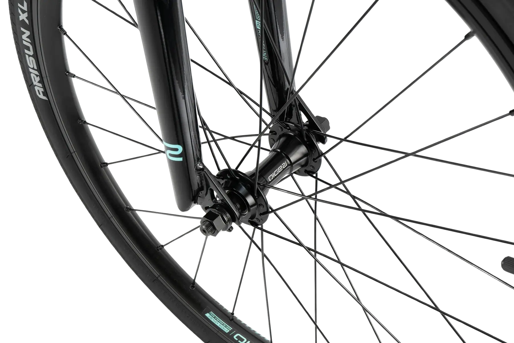 La fourche est en chromoly (CrMo), pivoté en 1-1/8″ butted. Elle dispose de jambes Hi-Ten avec un offset de 23 mm. Ce montage assure une rigidité et une réactivité accrues.