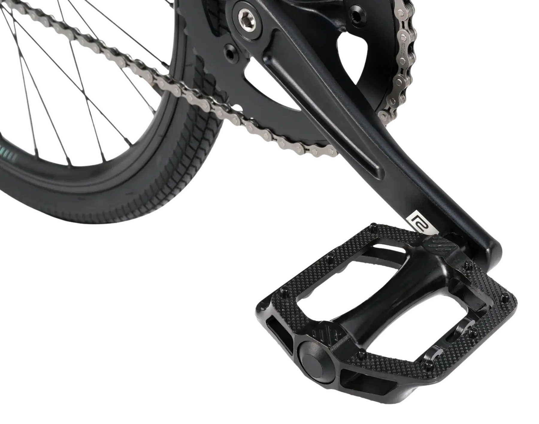 Les pédales en composite sont larges et antidérapantes. Elles garantissent un bon appui du pied. Ce composant participe grandement à la performance du pilote.