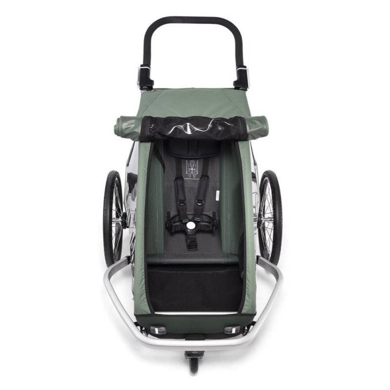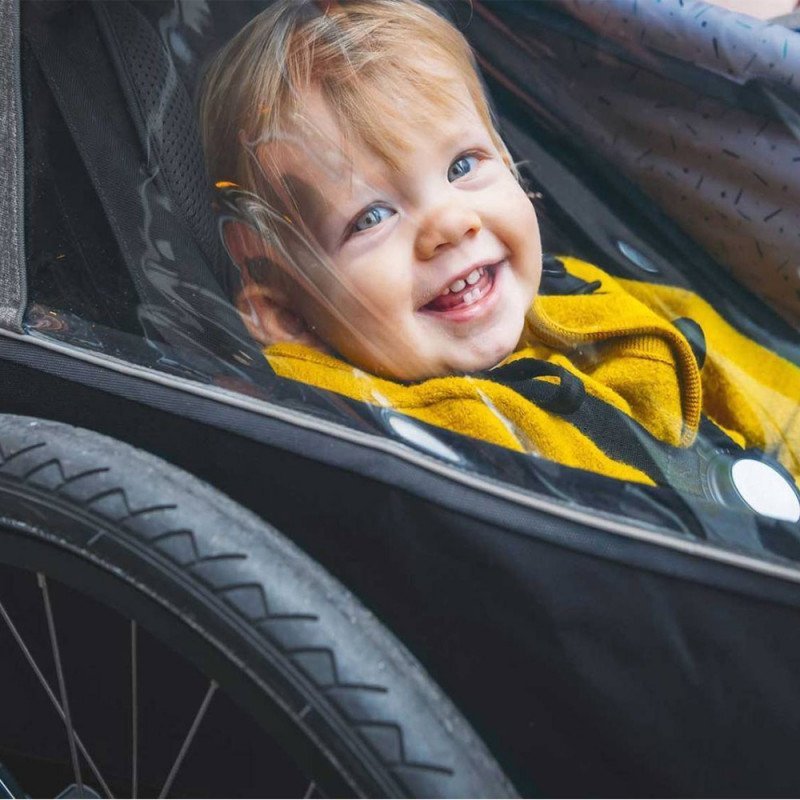 Cette remorque se transforme facilement en poussette ou en remorque de jogging grâce à son kit piéton fourni. Bien que le kit jogging soit vendu séparément, cette modularité permet de s’adapter à tous vos déplacements, que ce soit en ville ou en nature.
