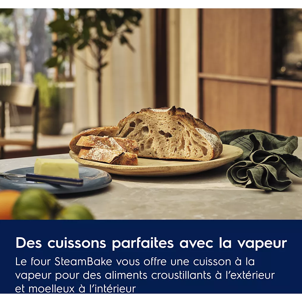 - Avantage du mode avec ajout de vapeurLa cuisson vapeur assistée permet de cuisiner à l’aide de la vapeur, afin d’obtenir des performances de cuisson améliorées. Elle est tout particulièrement recommandée pour le pain et la pâtisserie