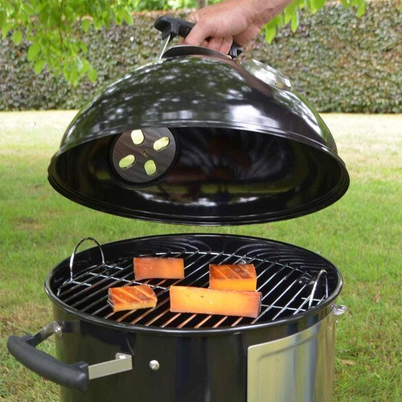 Fumez à froid ou à chaud gibier, poisson, truite et même fromage grâce aux grilles de cuisson robustes ou aux crochets de fumage qui s’adaptent au support inclus. En retirant la section centrale et le couvercle du fumoir vous le transformez en barbecue charbon traditionnel d’appoint.