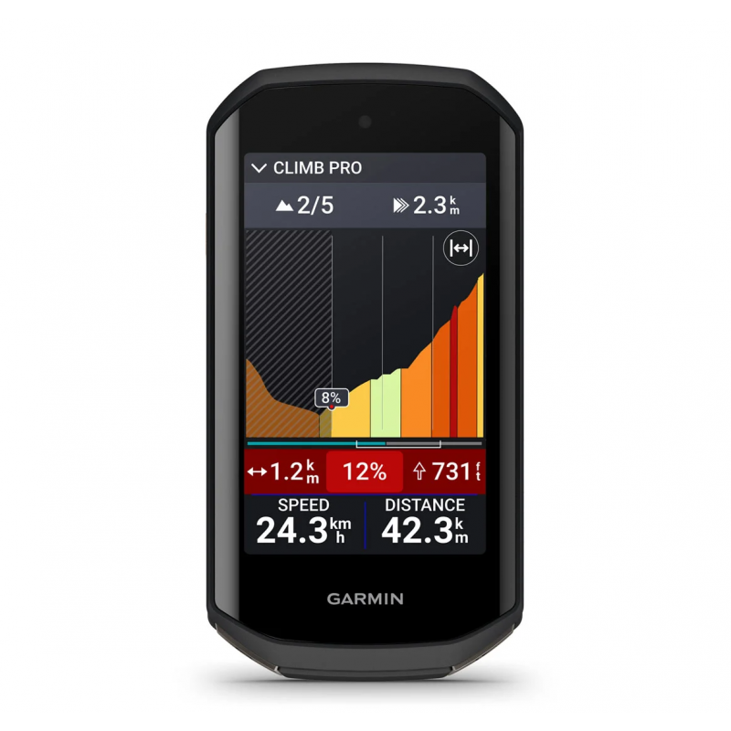 - Navigation : GPS multi-bandes (GPS, GLONASS, Galileo) pour une précision accrue. Cartes Garmin Cycle Map préchargées, avec superposition de cartes de popularité Trendline (basée sur des milliards de km de données Garmin Connect). Planification de routes directement sur l’appareil sans connexion internet, et ClimbPro en temps réel pour analyser les montées.