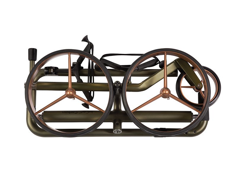 La nature est la source d’inspiration pour les tons verts irisés de ce chariot électrique sensationnel. Les reflets de la lumière font scintiller et briller élégamment le cadre en carbone et les jantes de couleur or rose.