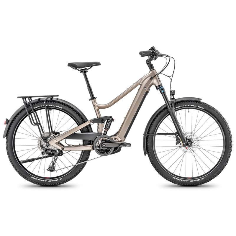 Le Moustache Samedi 27 Xroad FS 4 (625 Wh) trouve la meilleure formule entre confort et sportivité. Avec son apparence de VTT, il promet une bien belle expérience sur les chemins nature en forêt, les pistes en montagne ou les voies vertes. La configuration tout-suspendue combine le célèbre amortisseur Moustache Magic avec 100 mm de débattement et une fourche Suntour avec 120 mm. Souple en descente, réactif sur les petits chocs, le vélo reste facile et efficace au pédalage. Le cadre aluminium compact et les roues de 27.5″ offrent une conduite saine et confortable.