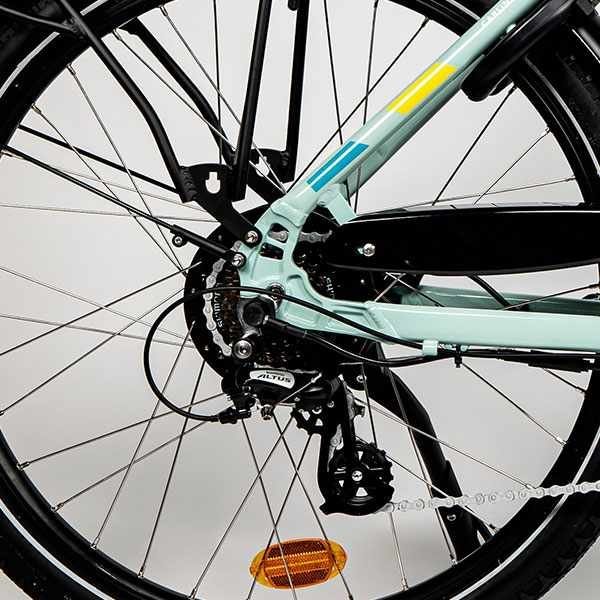 C’est un modèle de ville robuste et confortable, parfait pour les trajets du quotidien. Il est équipé d’une fourche suspendue. Le moteur dans la roue arrière apporte puissance et sensation de propulsion.