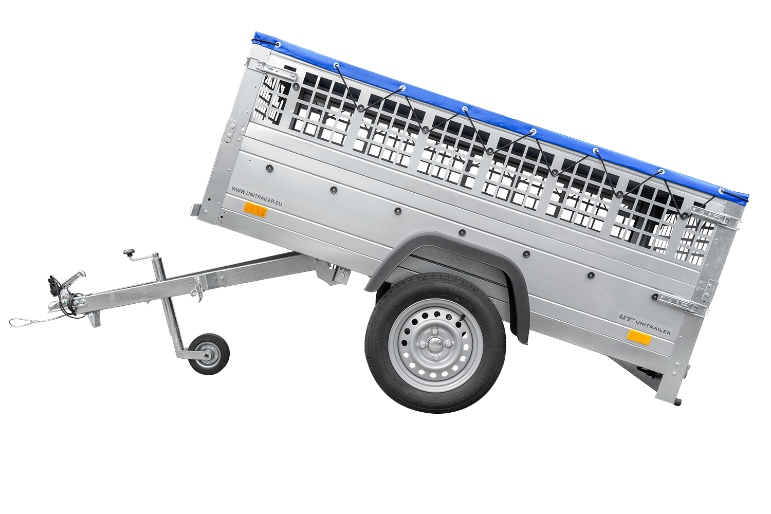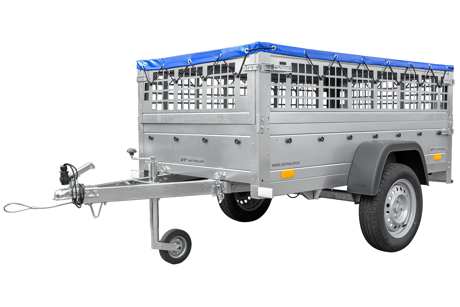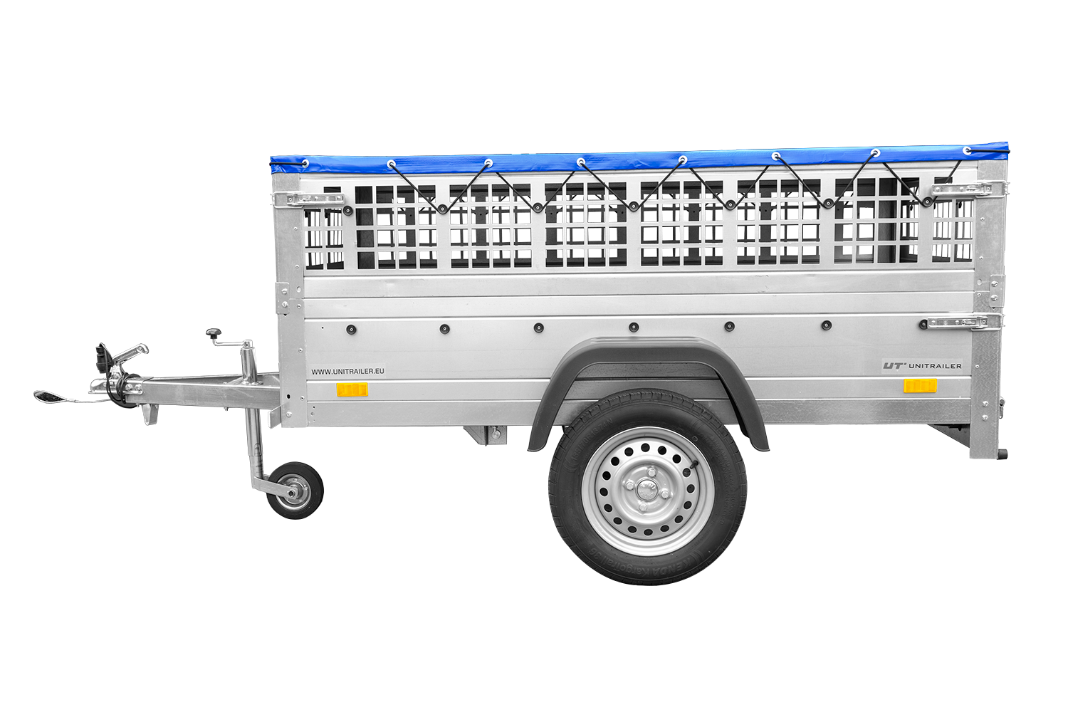 Remorque grillagée 200×106 avec bâche plate bleue, ridelles grillagées et roue jockey – Garden Trailer 200 KIPP