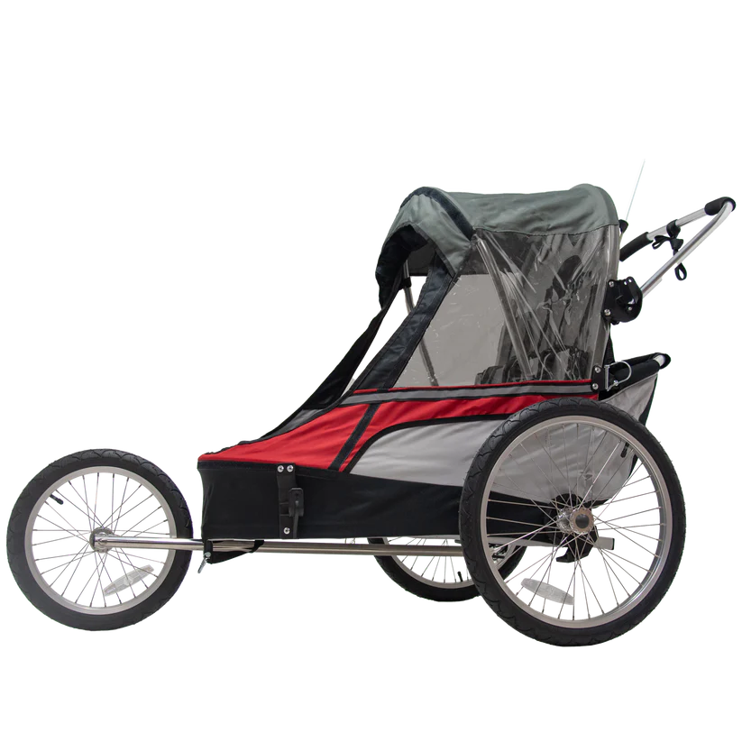 La Wike Premium Double se démarque par sa polyvalence, passant facilement du vélo à la poussette ou au jogging. Son châssis en aluminium allie légèreté et robustesse, tandis que les roues amorties assurent une conduite fluide sur tous terrains.