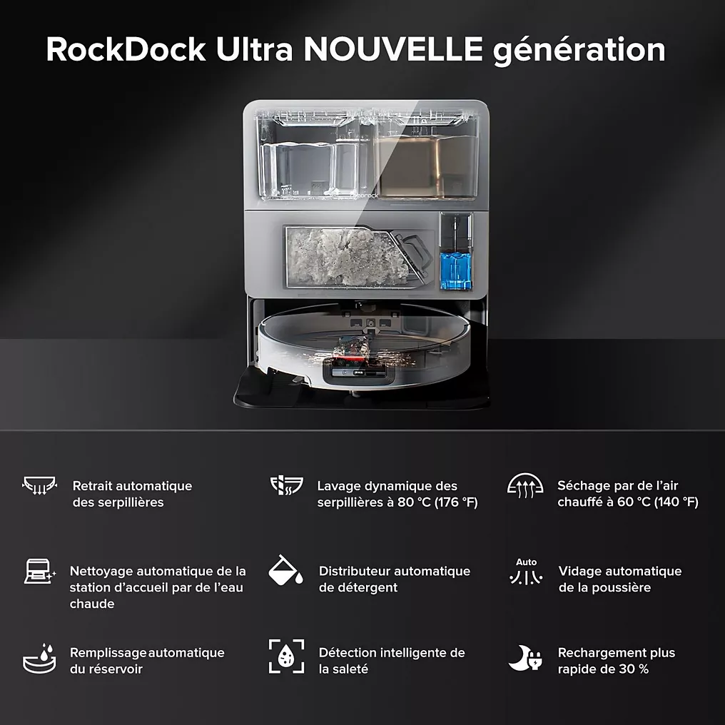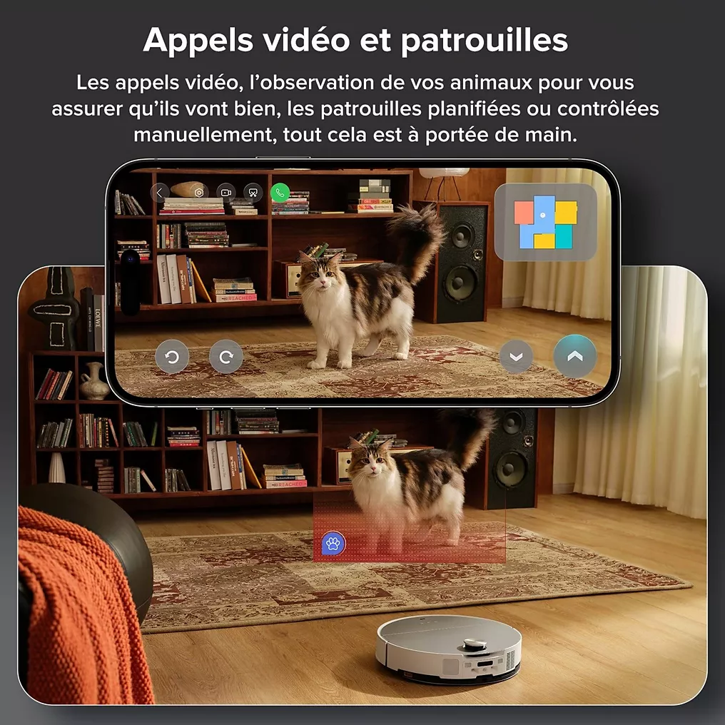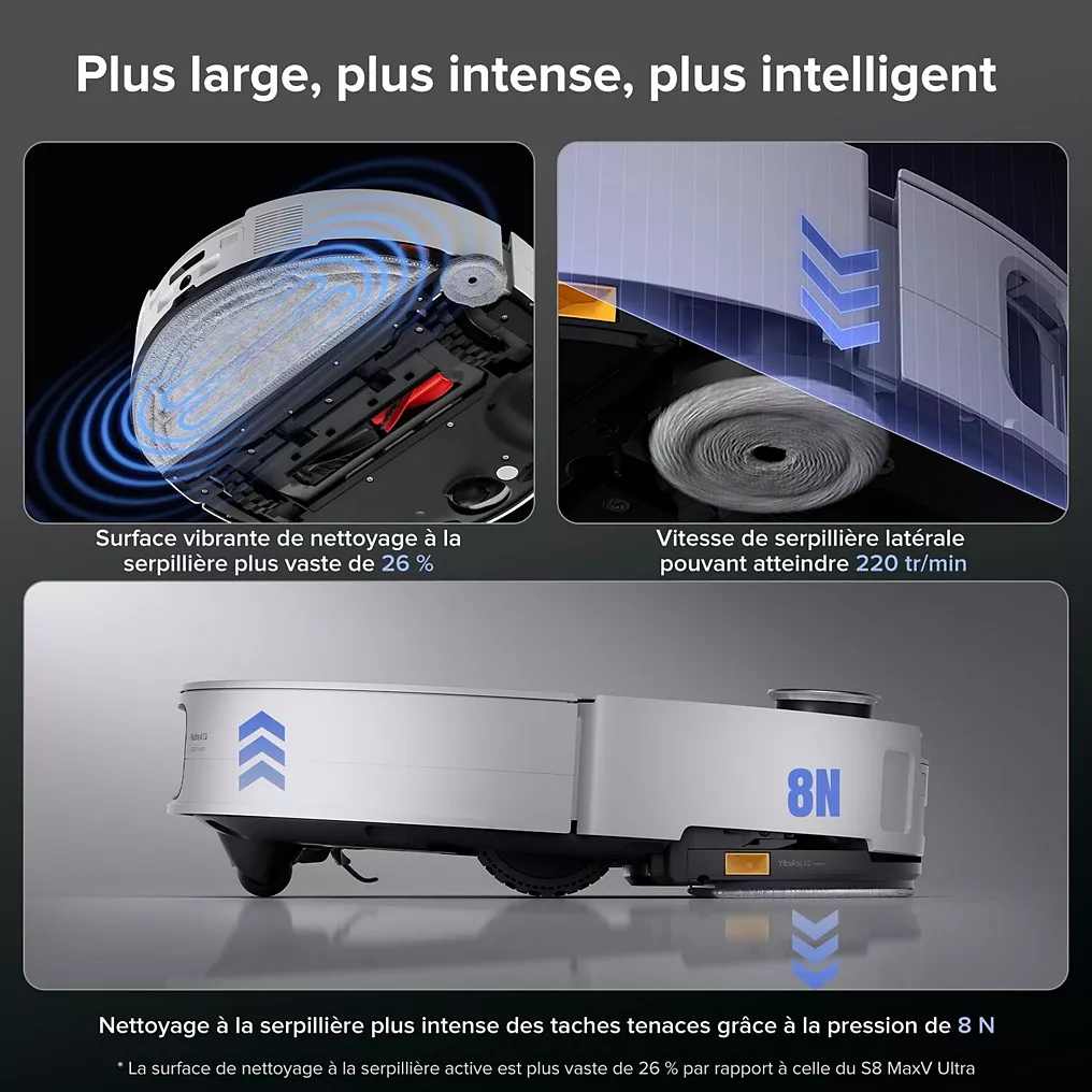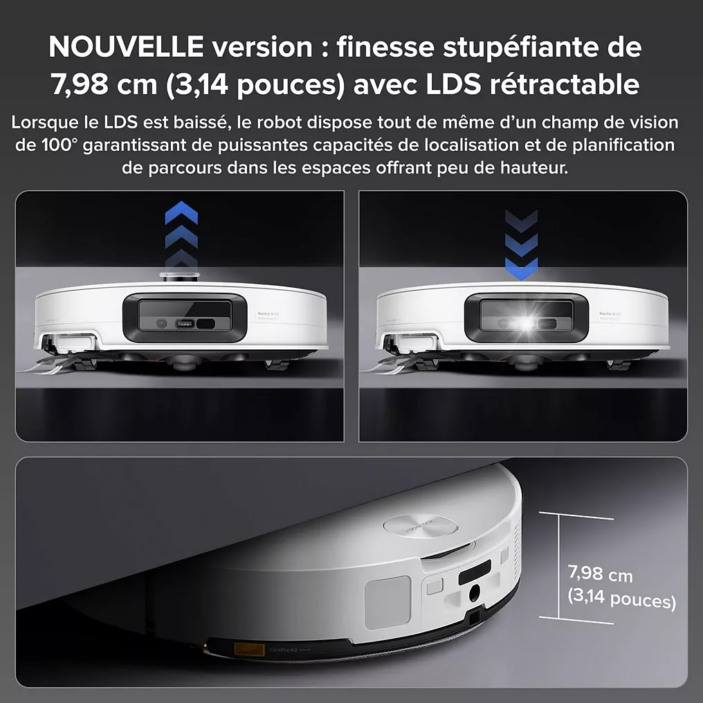 • Puissance d’aspiration : 22 000 Pascals – Hauteur du robot : 7,98 cm