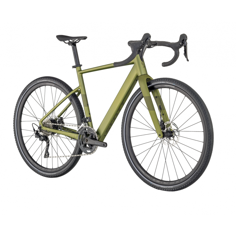 Scott équipe ce modèle d’un groupe Shimano GRX 400, spécialement conçu pour le gravel. Il s’agit d’un système 2×10 vitesses, combinant un pédalier 46/30 et une cassette 11-36. Ce montage offre un excellent équilibre entre rendement sur route et facilité dans les montées abruptes ou sur terrain irrégulier.