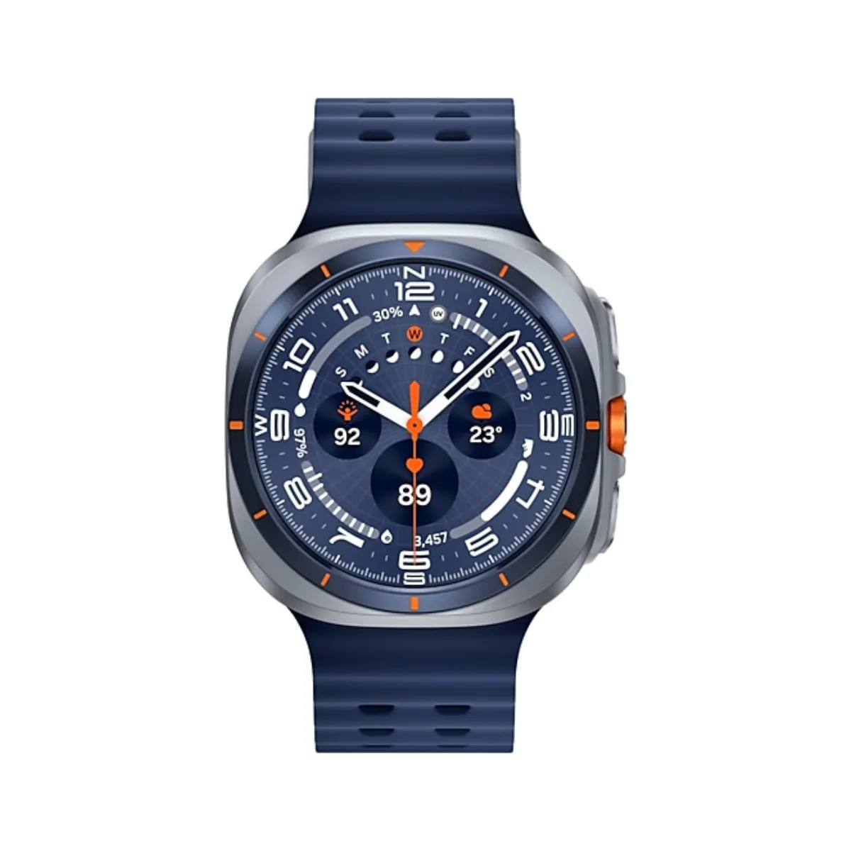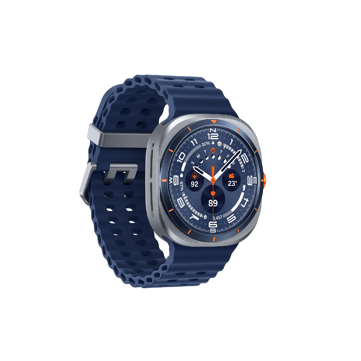 La Galaxy Watch Ultra a été conçue pour repousser les limites. Elle résiste à des températures allant jusqu’à 55 °C, à une altitude de 9000 m et à une pression d’eau jusqu’à 10 ATM le tout propulsé par un processeur de 3 nm. La batterie peut durer jusqu’à 100 heures en mode d’économie d’énergie. Le nouveau capteur BioActive et la Galaxy AI te suivent, te guidant pour dépasser tes propres limites. Maintenant disponible également en Bleu Titane robuste, résistant et prêt pour toute aventure.