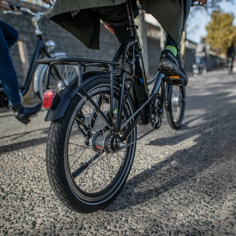 Pneus larges : Grâce à la taille 20 pouces et des pneus assez larges (~20×1,95 ou ~20×2), le vélo amortit mieux les irrégularités du sol (pavés, bordures, revêtement urbain) et offre une bonne adhérence dans les virages, sur surfaces humides ou glissantes.
