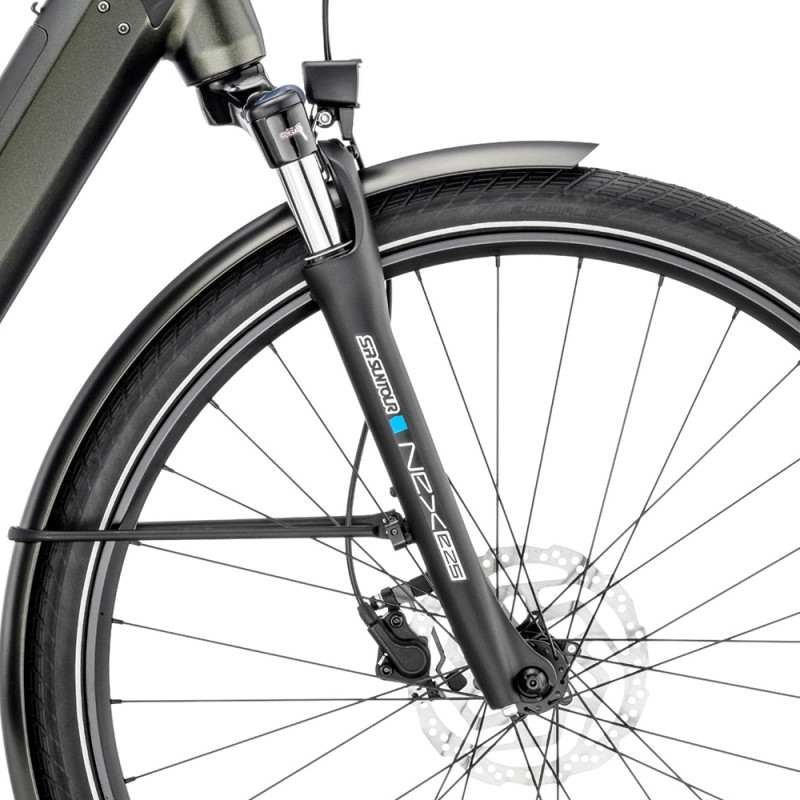 Le cadre du Samedi 28 accueille une fourche à suspension Suntour avec 63 mm de débattement et une tige de selle à ressort signée ExaForm. L’une et l’autre offrent un soutien précieux sur les petits pavés, les routes dégradées ou un chemin inégal. Appréciable sur les trajets vélotaf rapides ou les longues balades, le guidon et les poignées ergonomiques vous permettent d’avoir un appui naturel. Moustache a aussi intégré une potence réglable au cockpit, pour un confort sur-mesure.