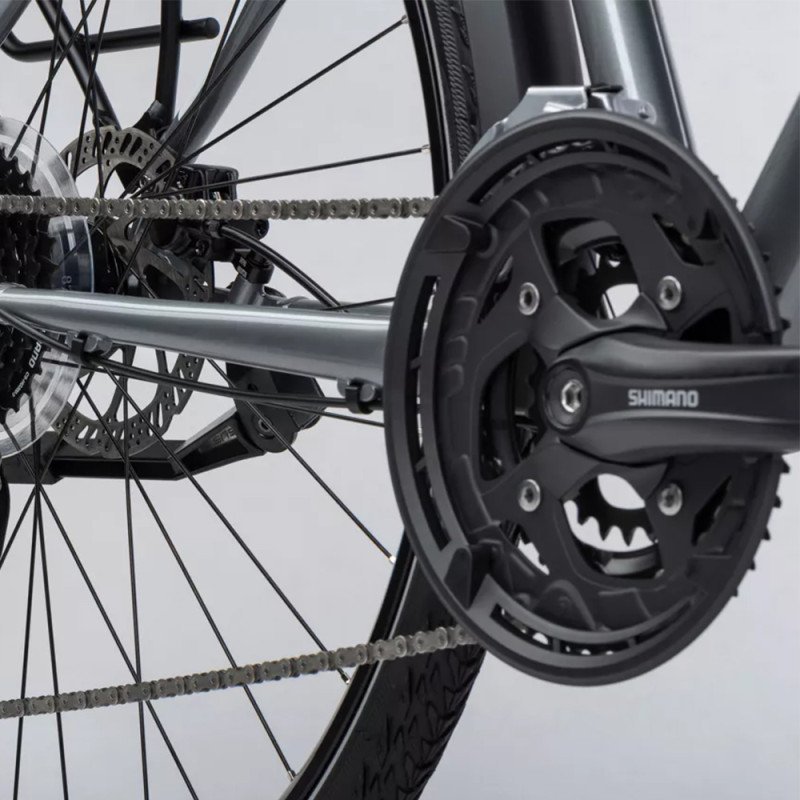 Ses roues de 28 pouces assurent une excellente inertie et une bonne capacité de franchissement. Les pneus légèrement crantés garantissent une adhérence optimale sur différents types de surfaces : bitume, gravier, terre battue ou pistes cyclables.