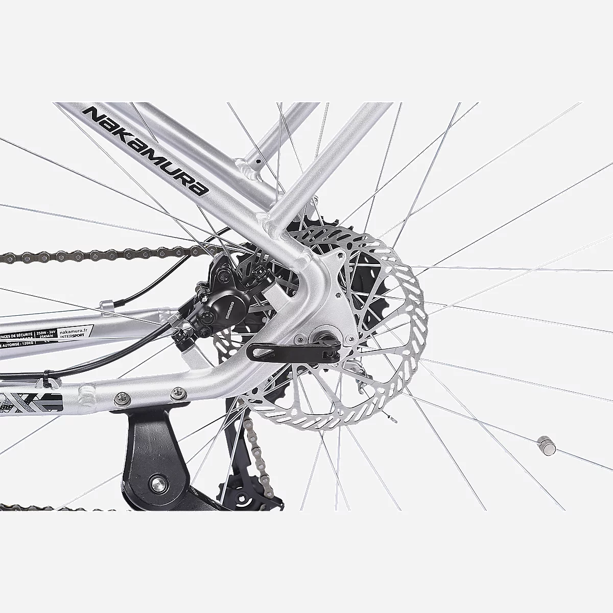 Le cadre en aluminium 6061 hydroformé du Nakamura E-Crossover A offre un parfait compromis entre légèreté et rigidité. Ce matériau, largement utilisé dans l’industrie aéronautique, assure une résistance exceptionnelle aux torsions et vibrations, tout en garantissant un comportement stable sur tous types de revêtements. La structure est pensée pour accueillir discrètement la batterie dans le tube diagonal, conférant au vélo une silhouette élégante et épurée.
