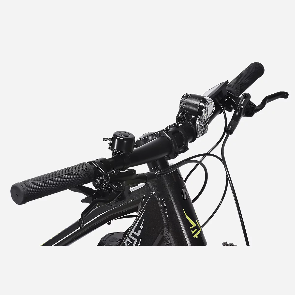 Le poste de pilotage (potence courte et cintre large de 700 mm) garantit un contrôle optimal, tandis que la tige de selle aluminium et la selle ergonomique assurent un confort prolongé même sur longues distances.