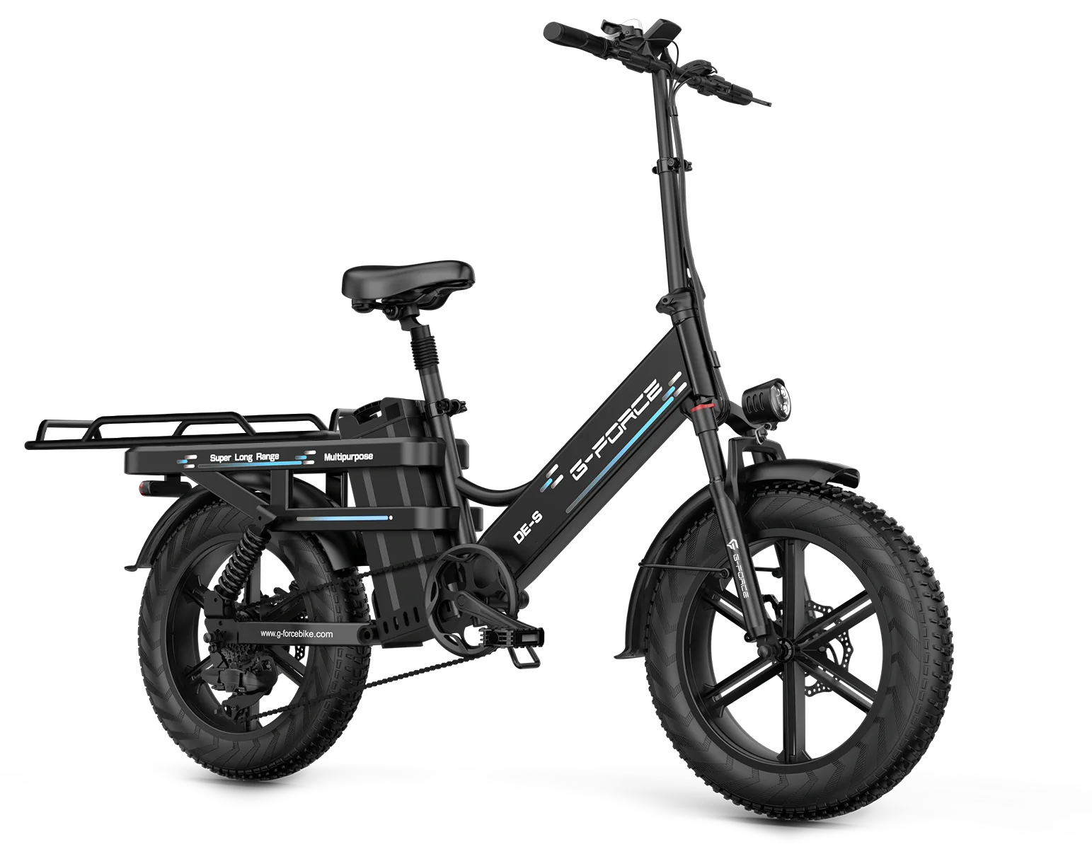 Le G-FORCE DE-S est équipé d’accessoires adaptés aux besoins quotidiens. Un porte-bagages permet de transporter facilement des charges. L’éclairage intégré garantit visibilité et sécurité dans l’obscurité.