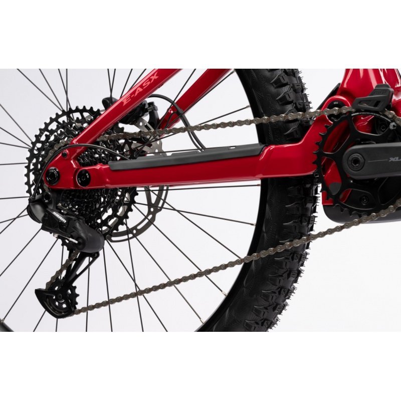 La suspension du E-ASX Essential offre 150 mm de débattement à l’avant et à l’arrière, ce qui le place dans la catégorie des all-mountain électriques. Ce débattement permet d’encaisser les chocs importants sur terrains accidentés tout en maintenant une position de pédalage efficace.